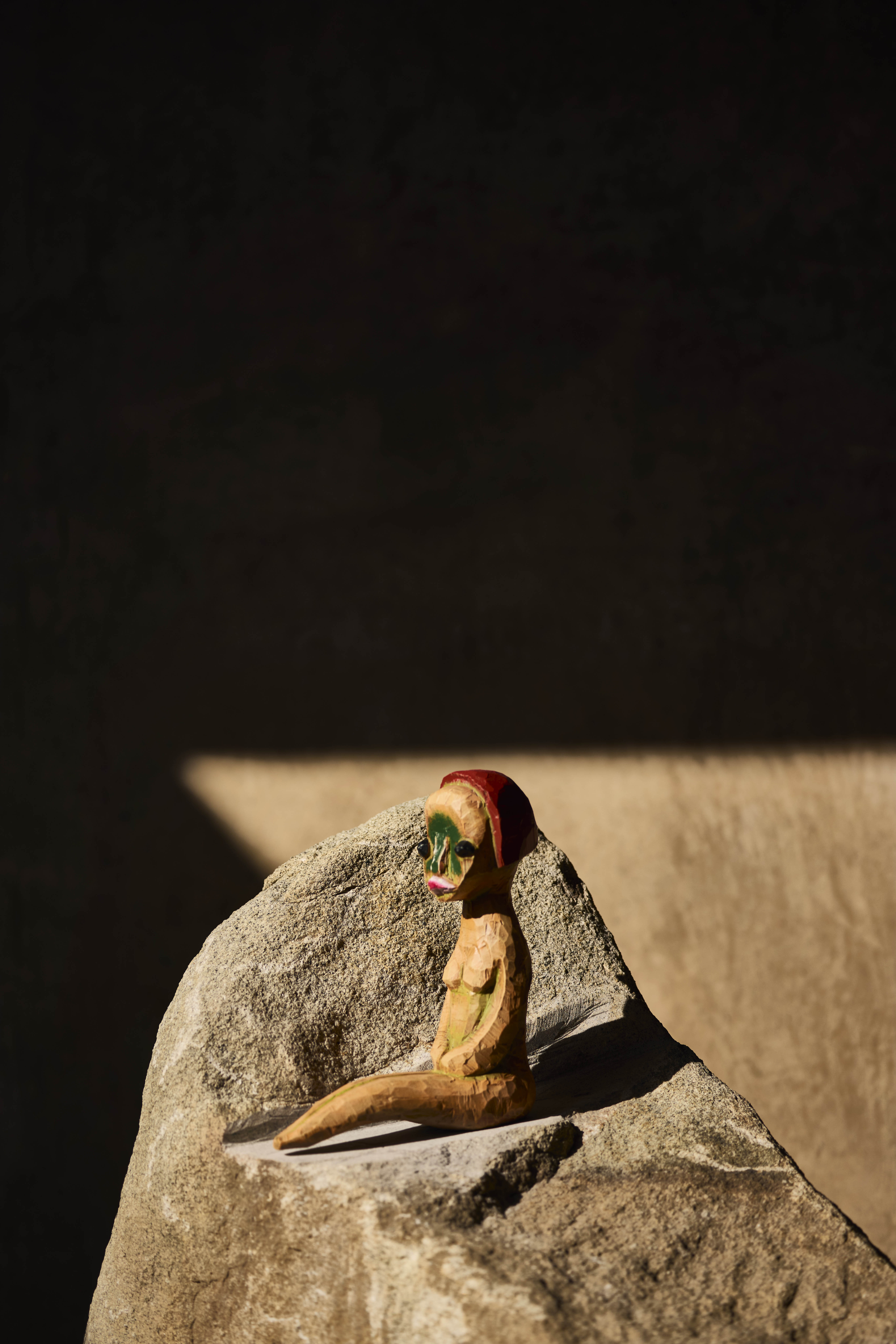 Around the age of thirty, Kato began focusing on the human form as a central motif, titling nearly all his works Untitled. His figures are unclothed and appear without any background or objects that would imply a particular context. What Kato sought was not to tell stories or convey emotion through his figures but to explore how to construct a painting using hitogata—the human-like forms that would become central to his work. Embodying a primal, universal form of humanity founded less on reason than on intuition, these magical beings invite viewers to recognize themselves. A turning point came around 2003, when, still feeling his way forward, Kato began working with wood. He recalls that the act of creating sculptural works in three dimensions helped him reconsider the relationship between human f igures and the two-dimensional worlds they inhabit on canvas.